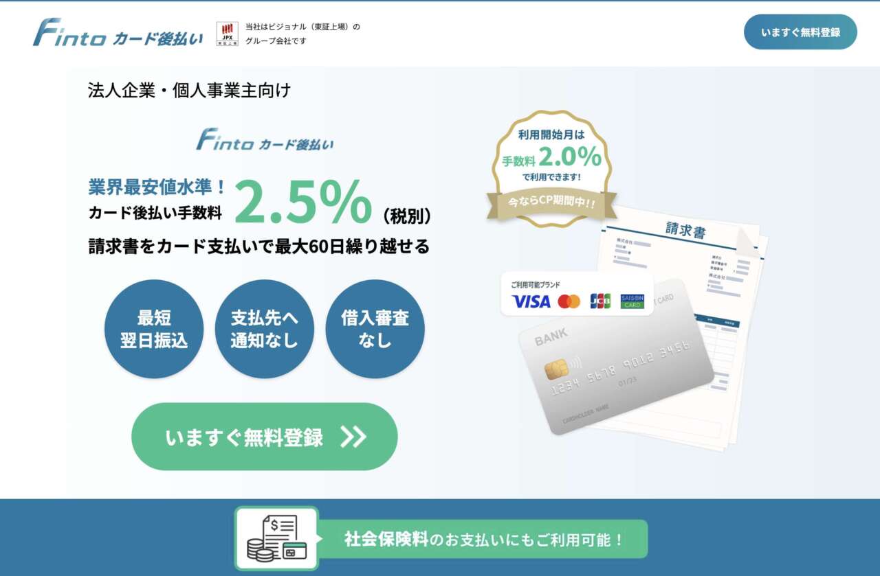 『Fintoカード後払い』は、トラボックス株式会社が運営するクレジットカードを利用した事業資金後払い決済サービス(一般に「請求書カード払いサービス」と呼ばれています)です。