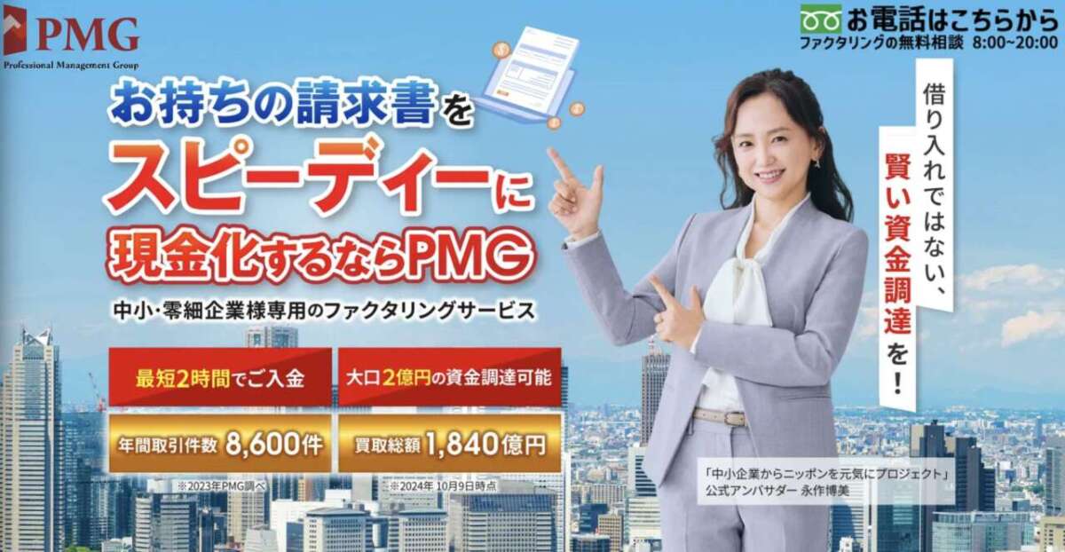 『PMG(ピーエムジー)株式会社』は、買取総額1,840億円年間の取引件数は8,600件をほこるファクタリング業界最大規模の会社です。